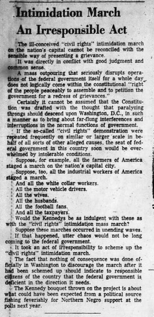 The march help bring about the adoption of the 1964 Civil Rights Act, legislation that some of my R friends like to boast happened because of “the Republicans who helped ensure its passage.”